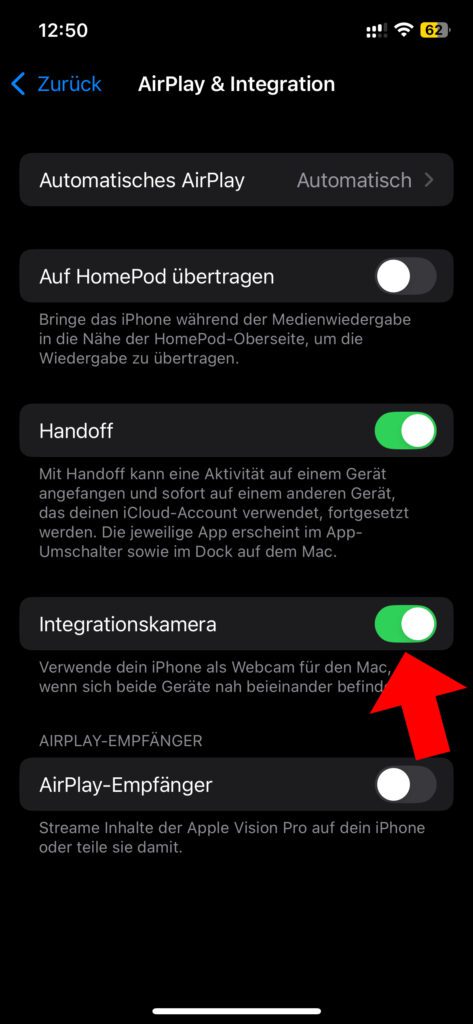 - Am iPhone ist in Einstellungen -> Allgemein -> AirPlay & Integration die Integrationskamera aktiviert