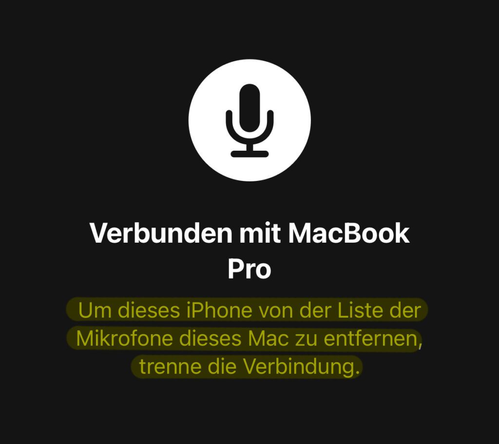 Wenn das beschriebene Vorgehen nicht funktioniert oder eine der Verbindungsvoraussetzungen (WLAN, Bluetooth) nicht erfüllt werden kann, ist das kein großes Problem. Dann kann das iPhone auch einfach per Kabel mit dem Mac verbunden werden. Sind beide Geräte verkabelt, dann wird das iPhone ebenfalls in den Ton-Einstellungen des Mac als mögliches Eingabegerät angezeigt. Wird es als Mikrofon genutzt, erscheint die oben gezeigte Display-Einblendung.