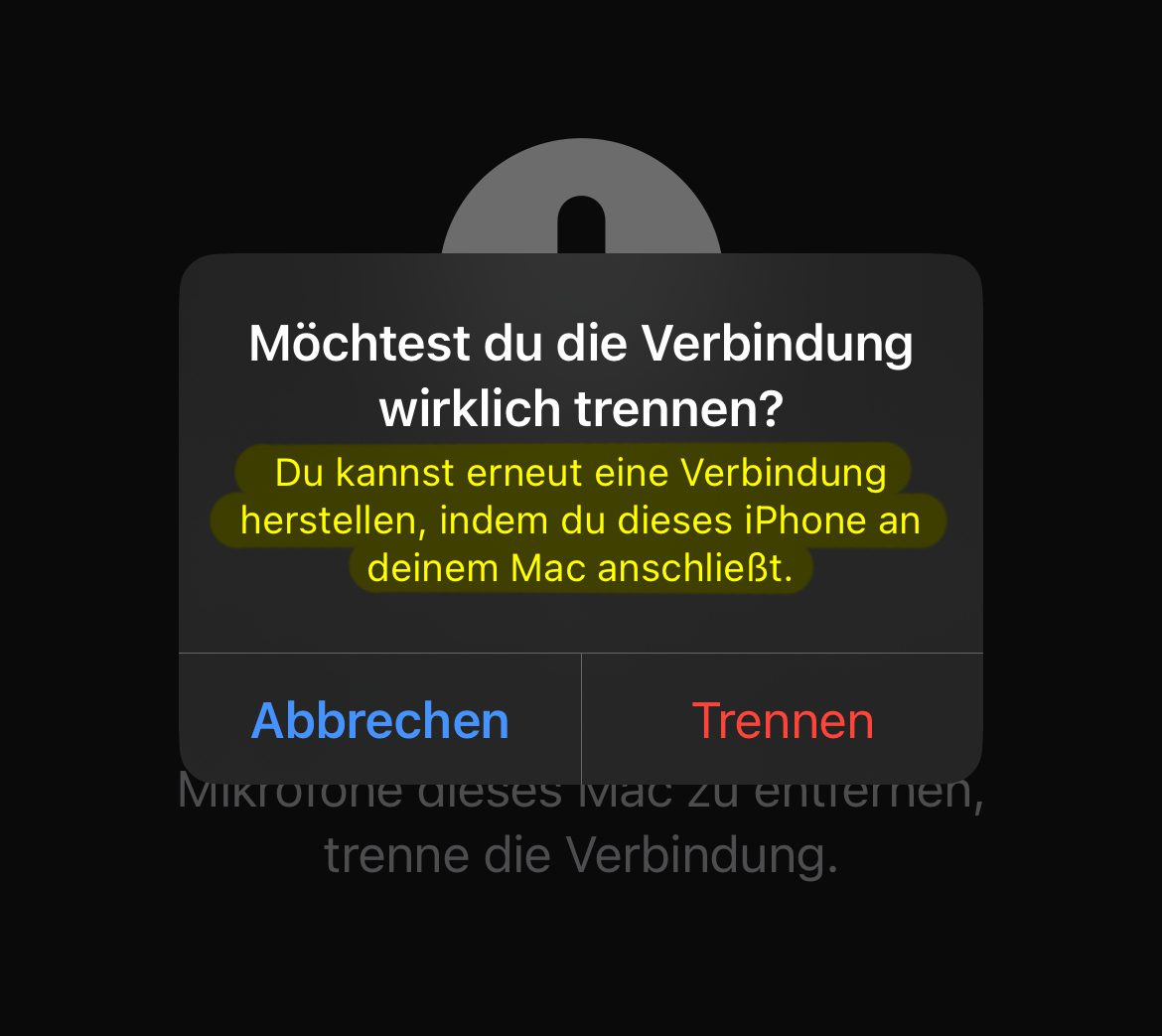 Hat man den roten Button auf dem iPhone genutzt, um die aktuelle Verbindung von iPhone und Mac zu trennen, ist das kein Problem. Wie der Warnhinweis nach dem Betätigen des Buttons bereits aufzeigt, so muss man die beiden Geräte nur mit einem Kabel verbinden, um die Integrationskamera-Funktion erneut nutzbar zu machen. Dann wird das iPhone in den Ton-Einstellungen des Mac auch wieder als Mikrofon angezeigt.