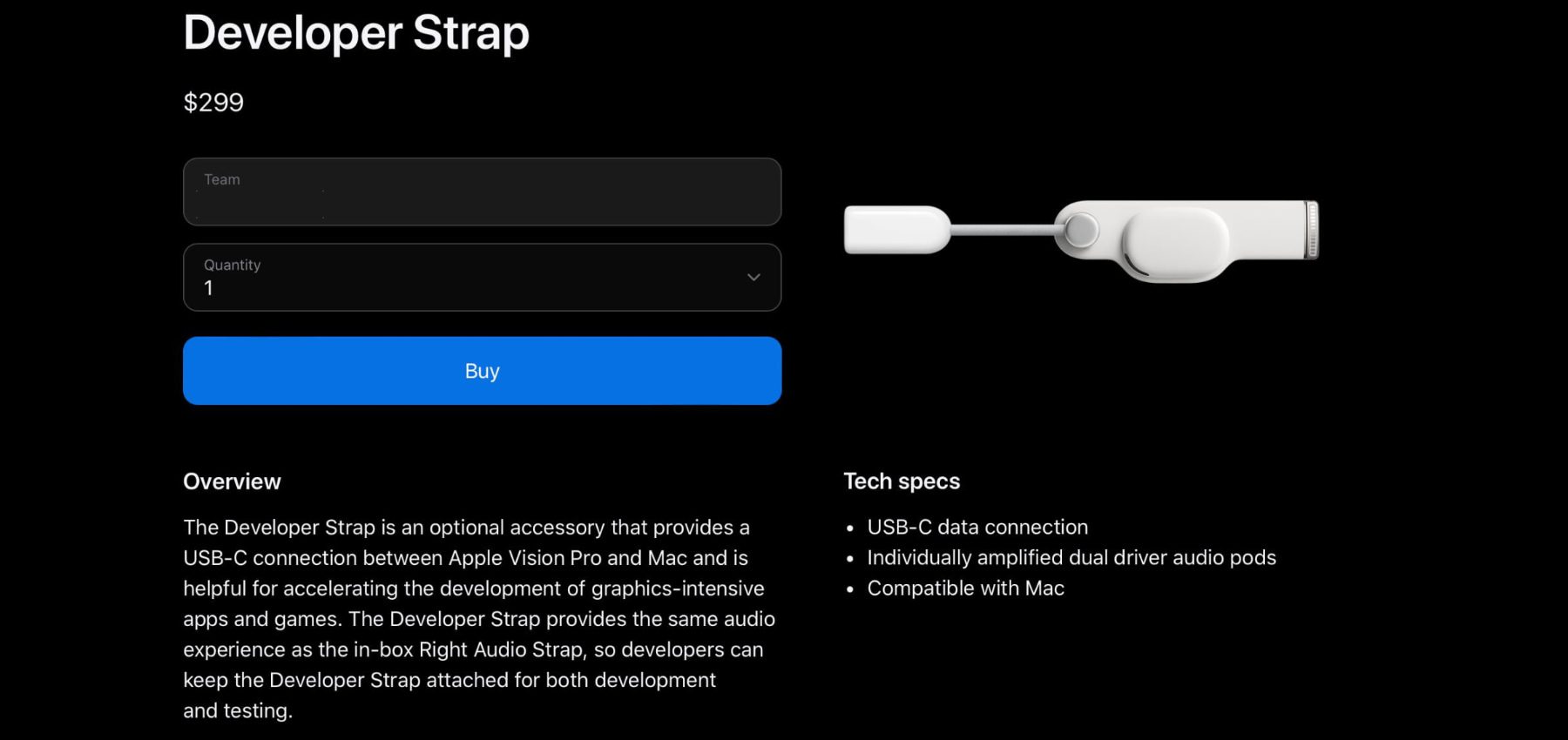 Wer am Developer-Programm von Apple teilnimmt und neben den jährlich dafür zu zahlenden $99 auch noch weitere $299 herumliegen hat, kann sich (aktuell nur in den USA) für die Apple Vision Pro – ihrerseits ab $3.499 zu haben – den sogenannten „Developer Strap“ kaufen. Der Vision Pro Developer Strap wird am Steckplatz des rechten Lautsprecher-Bands installiert und bietet einen USB-C-Anschluss für die Kabelverbindung mit dem Mac. Diese ist schneller und stabiler als die Funkverbindung per WLAN, was die Datenübertragung sowie das Testen von Apps vereinfacht. Für diesen Beitrag habe ich euch noch ein paar zusätzliche Infos dazu zusammengetragen.