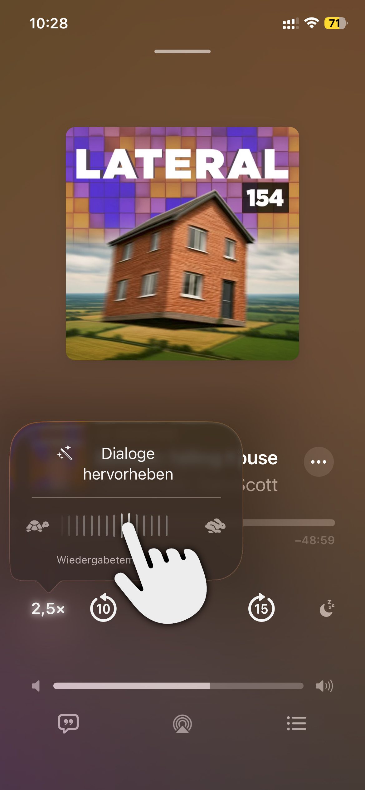 Am iPhone und iPad hält man dafür den Finger auf der Auswahl und wischt nach links (schneller) oder rechts (langsamer). Hase- und Schildkröte-Symbole helfen bei der Orientierung: