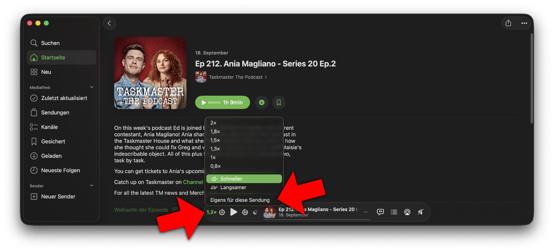 Am Mac gibt es in der Geschwindigkeitsauswahl den Hase-Button „Schneller“ und den Schildkröte-Button „Langsamer“. Ein Klick auf einen der Buttons sorgt für die Beschleunigung bzw. Bremsung um je 0,1x. Ein Klick auf „Eigens für diese Sendung“ speichert die Geschwindigkeit für die Episoden des aktuellen Podcasts, übernimmt sie aber nicht für andere Sendungen.