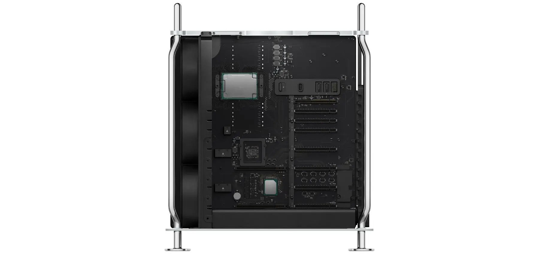 Zudem kam die Leistung von sechs Afterburner-Karten zum Einsatz, also die Unterstützung von bis zu 22 gleichzeitigen Streams von 8K ProRes-Video. Der interne Speicher von bis zu 8 TB war erweiterbar. Die dafür integrierten PCIe-Steckplätze konnten zudem für andere Erweiterungen (außer Grafikkarten) genutzt werden.