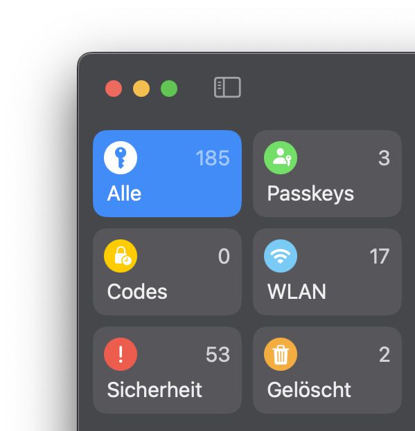 Bei aktivierter Seitenleiste werden in der Passwords App am Apple Mac sechs verschiedene Kacheln angezeigt. Diese sind relativ eindeutig benannt und liefern mit einer Zahl in der oberen rechten Ecke jeweils einen ersten Eindruck davon, wie viele Einträge jeweils gelistet sind. Das sind die einzelnen Passwörter-Kacheln im Detail: