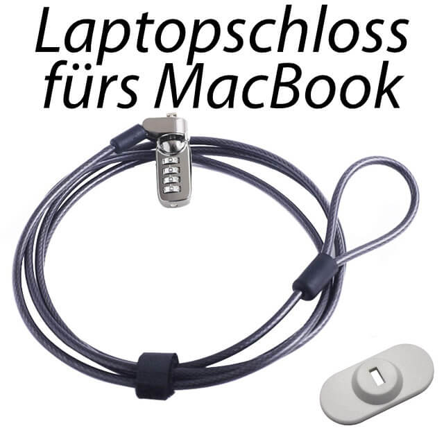 Ein Laptopschloss fürs MacBook funktioniert nach dem gleichen Prinzip, nur dass erst einmal eine Aussparung für das T-Stück geschaffen werden muss. Aber keine Angst: ihr müsst nicht am Gehäuse rumfräsen oder so. Vielmehr wird ein kleines Bauteil auf das MacBook geklebt (respektive angeschraubt), in dem sich ein Schlitz für ein wie oben beschriebenes T-Stück befindet. Am besten wird es auf die Oberseite, also die Rückseite des Displays geklebt; denn so stört es weder beim Transport noch bei der Nutzung des Laptops. Ein Laptopschloss für MacBook / Pro / Air findet ihr bei Amazon in verschiedener Ausführung, wie hier oder hier oder hier.