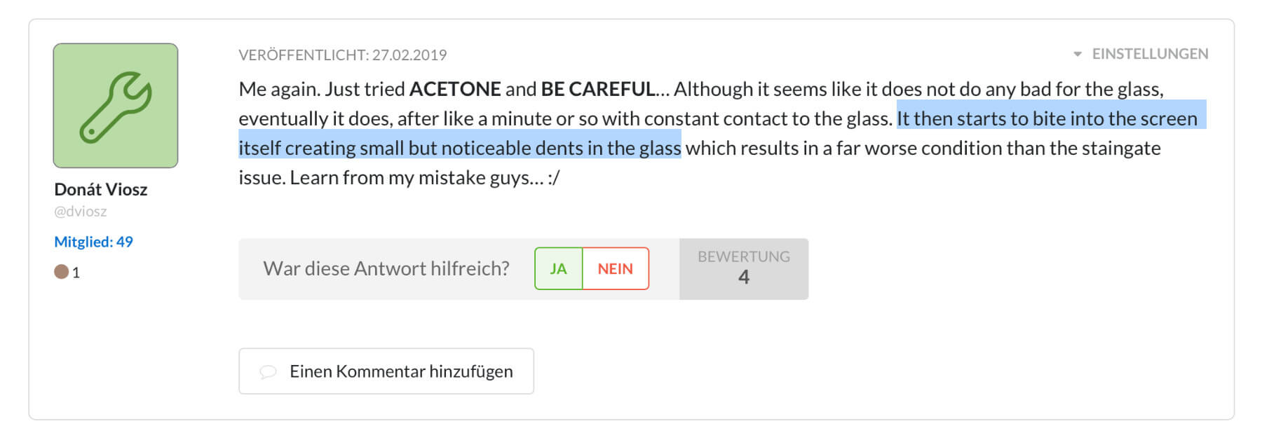 Im verlinkten Thread des iFixit-Forums gibt es aber nicht nur positive Rückmeldungen zu einigen Hilfsmitteln, Chemikalien und Reinigern. Während Farbverdünnung keinen oder nur einen leichten Effekt zeigte, wird vor Aceton bzw. Azeton gewarnt. Zwar kann es die Beschichtung des Displays ablösen, sollte aber auf selbiges nicht zu lange einwirken. Ein schnelles Entfernen und Reinigen des Displays ist daher, falls ihr es wirklich ausprobieren wollt, absolut notwendig. Denn sonst kann das Display beschädigt werden; es können sich Dellen formen und das Glas milchig werden, was am Ende noch schlimmer ist als die Schlieren des Staingate.