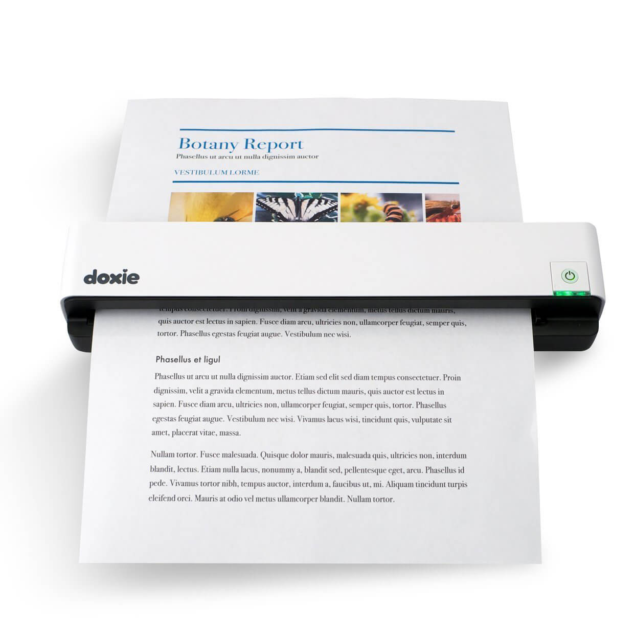 - Alle Doxie Modelle arbeiten mit einem Einzug, der das Dokument einzieht und auf der Rückseite wieder auswirft – das funktioniert nicht nur bei A4-Blättern, sondern auch bei Quittungen, Fotos, Rechnungen, Notizzetteln oder ähnlichem.