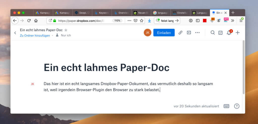 Meine erste Lösung, die ich in den letzten drei Tagen genutzt habe, ist eher Symptombekämpfung. Ich bin nach einem Test von meinem Firefox Browser auf Safari und Chrome ausgewichen. Die anderen beiden Browser lassen nämlich eine flotte Bearbeitung des Dokumentes zu, während mein Firefox weiterhin bei einem Zeichen pro Sekunde bleibt, was die Bearbeitungsgeschwindigkeit betrifft. Das löst zwar nicht mein Problem, aber ich konnte erst mal wieder in Dropbox Paper arbeiten.