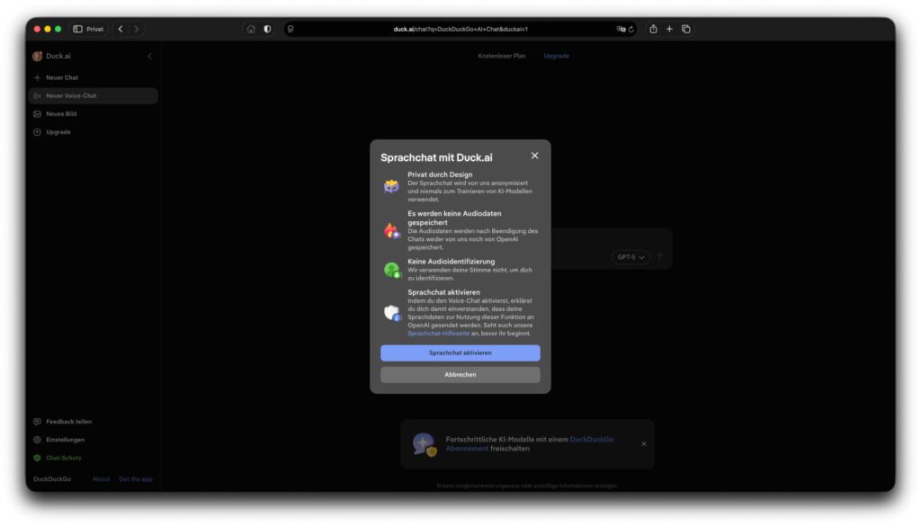 Während für die Text-Chatbots verschiedene Anbieter und Modelle ausgewählt werden können, kommt für den Sprachchat von DuckDuckGo (bisher nur) die KI von OpenAI zum Einsatz. Jedoch wird dabei versprochen, dass OpenAI die Sprachchats weder zur Identifikation noch zum KI-Training nutzt. Auch sollen Fragen und Antworten nicht als Audiodateien gespeichert werden.