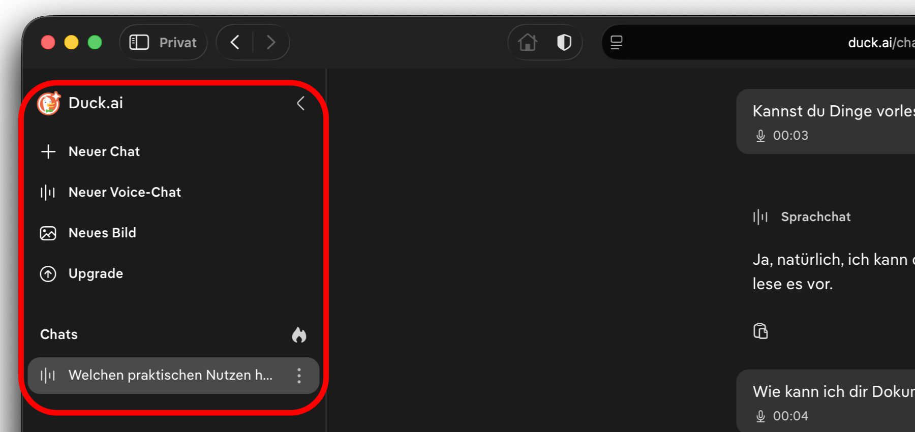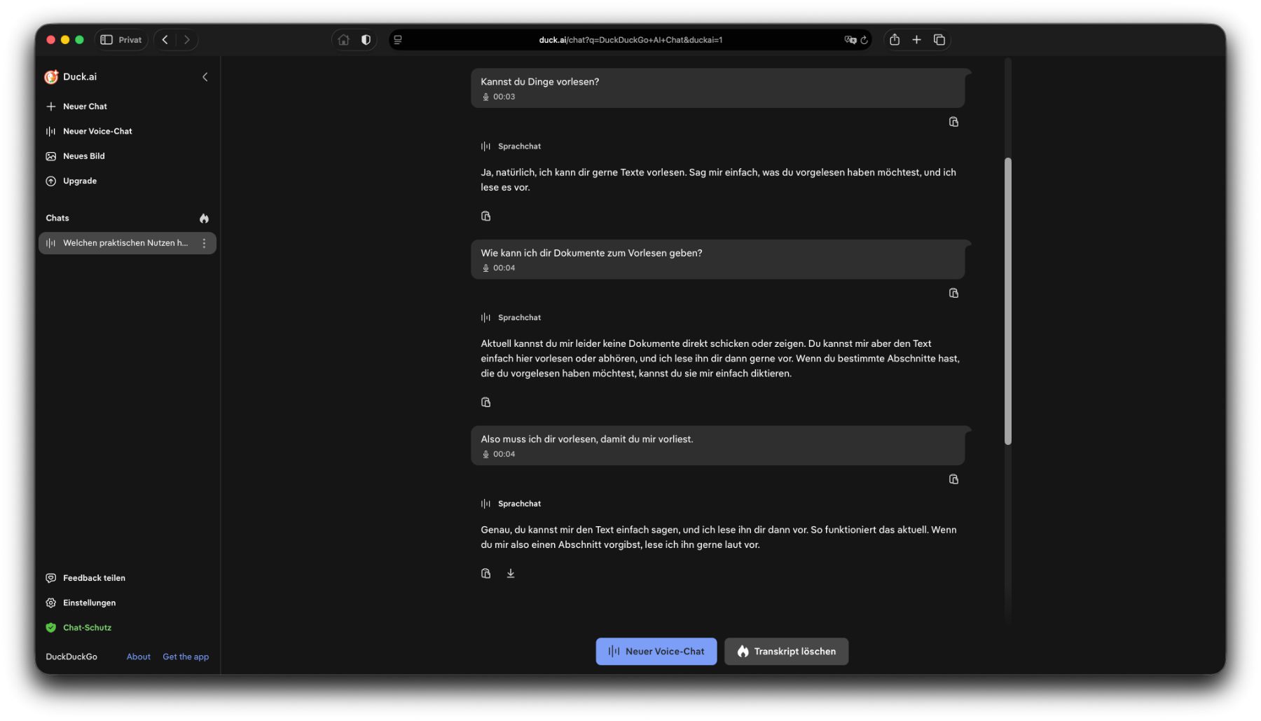 Die Sprachchats können nach ihrer Beendigung als Transkripte nachvollzogen werden. Jeder Chat bietet dabei ein eigenes Transkript. Die einzelnen Chats werden dabei links auf der Webseite in einer Seitenleiste abgelegt. Sie lassen sich einzeln löschen oder über das Flammensymbol gesammelt vernichten. Neben Sprach- und Text-Chats bietet Duck.ai auch die Bilderstellung kostenlos sowie ohne Account-Erstellung oder andere Datenübermittlung an.