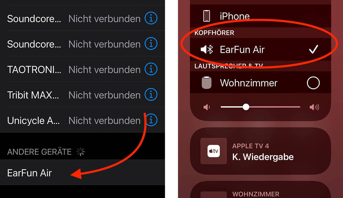 Das Pairing der Kopfhörer ist sehr einfach gemacht. Nimmt man die Ohrstöpsel das erste Mal aus dem Case, sind sie bereits im Pairingmodus. Man ruft im iPhone also nur Einstellungen > Bluetooth auf und findet dort ganz unten die EarFun Air, die auf die Verbindung warten. Multi-Point-Pairing (also das Verbinden mit mehreren Quellen) wird meines Wissens nicht unterstützt.