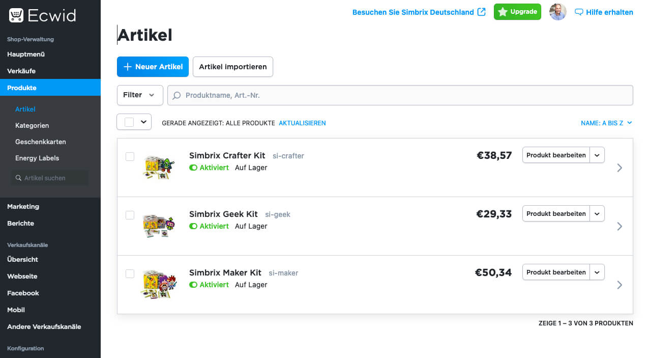 Irgendwann bin ich auf die Shop-Lösung Ecwid gestoßen, die sogar einen dauerhaft kostenfreien Tarif anbietet, wenn man maximal 10 Produkte anlegt und mit ein paar Einschränkungen leben kann. Eine davon ist zum Beispiel, dass man eine Subdomain von Ecwid verwenden muss, die bei uns so lautet: simbrix.company.site