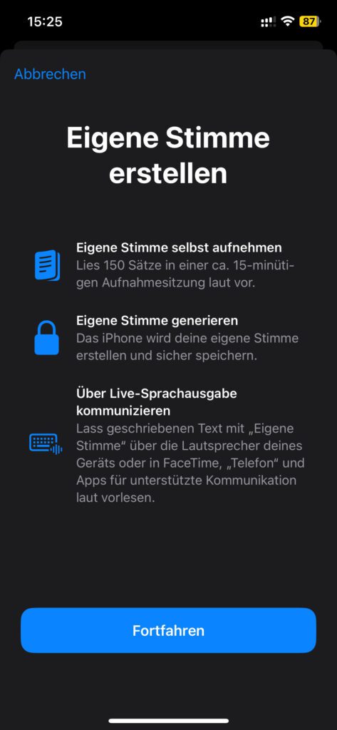 - Eigene Stimme generieren: Das iPhone wird deine eigene Stimme erstellen und sicher speichern.