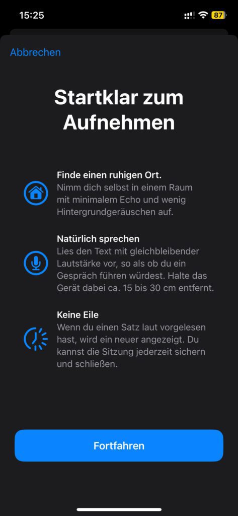 Habt ihr mit den Schritt-für-Schritt-Anleitungen den Weg zur richtigen Einstellung auf eurem Apple-Gerät gefunden, dann geht es los. Die Display-Hinweise geben euch einige Informationen über den Ablauf der „Personal Voice“-Erstellung, über den einzuplanenden Zeitraum, über die gewünschte Umgebungslautstärke (bzw. Stille) und so weiter. Lest euch das aufmerksam durch und tippt oder klickt dann erst auf „Fortfahren“.