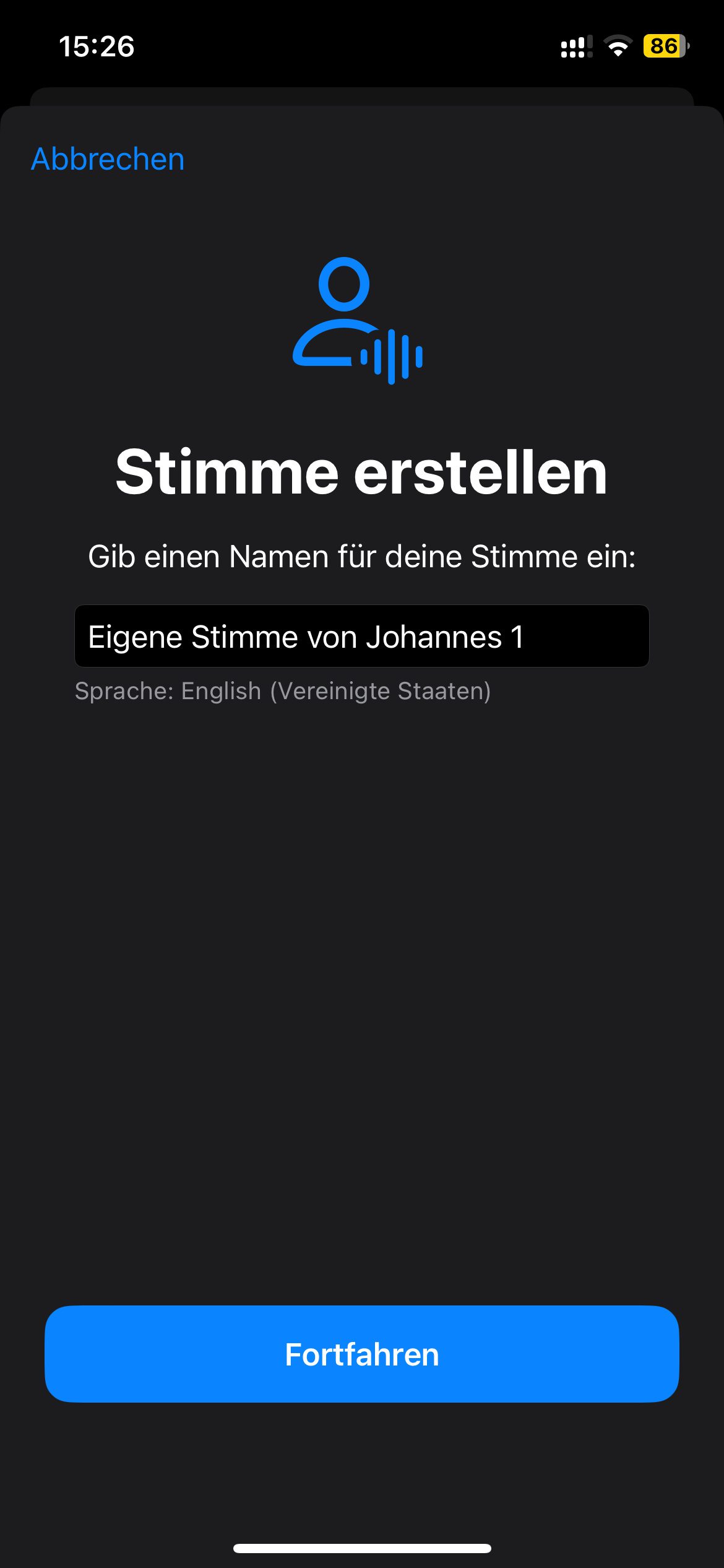 Denn hier gibt man den Namen für die Stimme ein (scheinbar kann man mehrere erstellen) und wählt dann nochmals „Fortfahren“. Aber unter dem Namensfeld für die Stimme gibt es den kleinen Hinweis: Sprache: English (Vereinigte Staaten). Eine Auswahl anderer Sprachen gibt es (bisher) nicht.