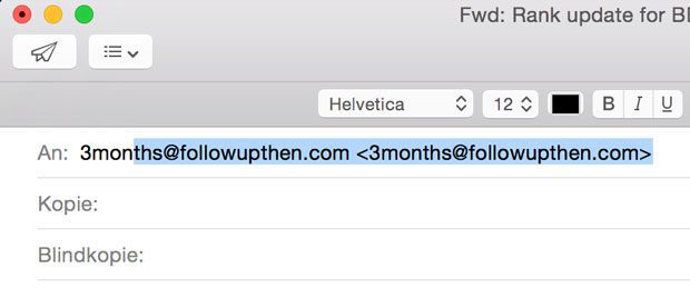 Im Followupthen-Adminbereich gibt man seine Zeitzone an und kann man dann manuell „Reminder“-eMails anlegen. Die einfachere Alternative ist aber, dass man eine Mail an autocomplete@fut.io schickt (die muss keinen besonderen Inhalt haben und kann auch komplett leer sein). Nachdem man diese Mail verschickt hat, erhält man eine Antwort, auf die man wiederum mit „Reply to all“ im Mailprogramm antwortet und die Mail wegschickt. Der Hintergrund ist, dass man damit die wichtigsten Followupthen-Emails schon einmal „angeschrieben“ hat. Damit ist die Mailadresse dem Mailprogramm bekannt und man profitiert in Zukunft von der Autovervollständigen-Funktion. So muss man nur noch „3mo“ tippen und das Mailprogramm schlägt dann „3month@followupthen.com“ vor.