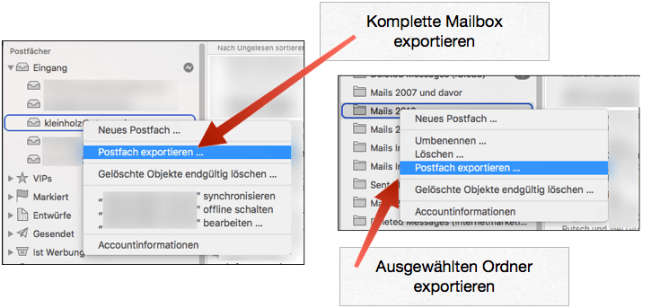 Ich selbst benötige die ganzen Funktionen der Programme nicht und war unschlüssig, was ich jetzt machen sollte. Letztendlich hat mir ein kleiner Artikel über die Archivierungsfunktion von Apple Mail gezeigt, dass ich gar keine extra Software benötige, denn die Funktion „Postfach exportieren“ macht in Apple Mail genau das, was ich gesucht habe: Sie sichert ein komplettes Postfach oder einen Ordner mit Mails als .mbox Datei, die man auf eine externe Festplatte kopieren kann und bei Bedarf auch wieder in Apple Mail importieren kann.