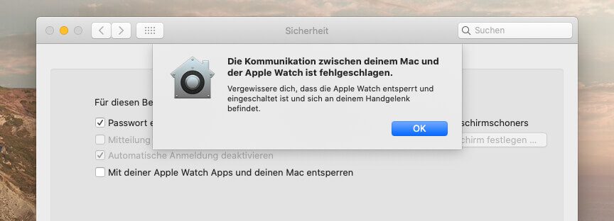 Die Kommunikation zwischen deinem Mac und der Apple Watch ist fehlgeschlagen. Vergewissere dich, dass die Apple Watch entsperrt und am Handgelenk ist und das iPhone entsperrt ist.