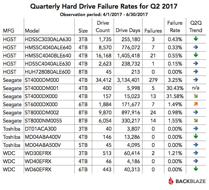 Festplatten-Ausfall-Statistik von Backblaze Q2/2017