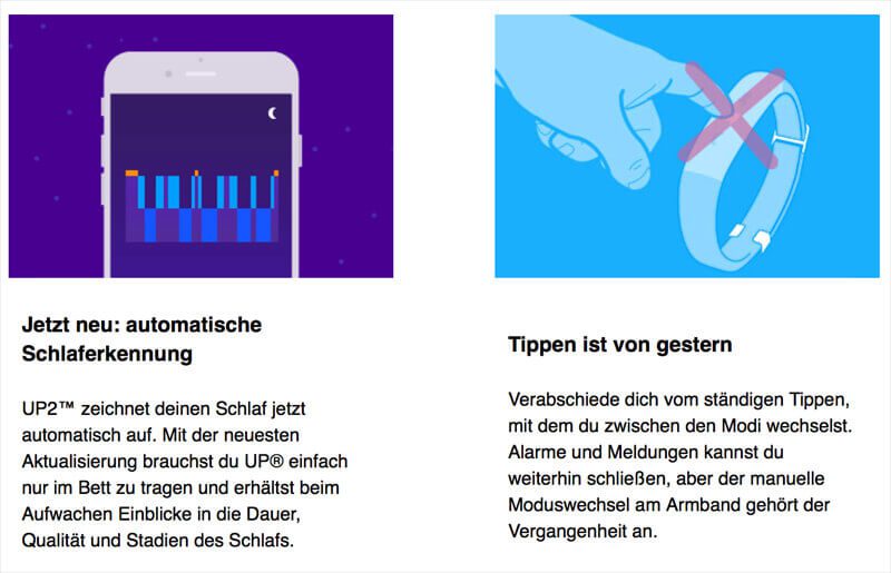 Bisher war es beim UP2 immer so, dass man abends vor dem Schlafen durch Tippen am Armband mitgeteilt hat, dass man noch Schlafen geht. Dann hat das UP den Schlaf bzw. die Bewegungen für eine Analyse aufgezeichnet und am nächsten Morgen nach dem Wach werden, hat man den Schlafmodus per Tippen wieder beendet. Das war nicht schlimm, aber ich habe es einfach häufiger mal vergessen, besonders wenn ich beim Lesen eingeschlafen bin. ;-)
