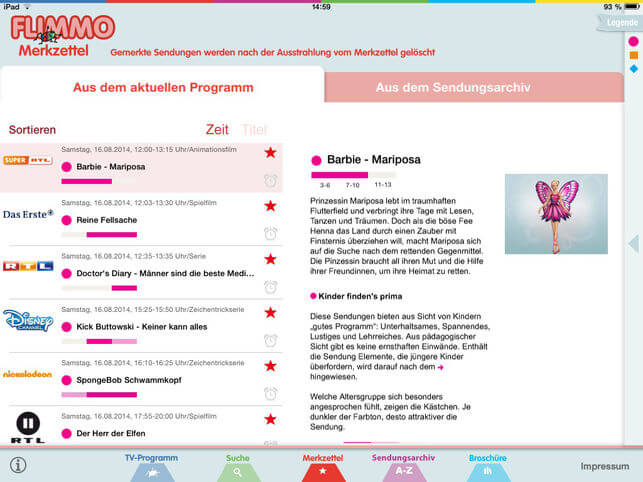 Ihr könnt in der App auch nach einzelnen Inhalten suchen oder Filter nutzen, um bestimmte Inhalte vorgeschlagen zu bekommen. So könnt ihr das Programm der kommenden sieben Tage einfacher durchsehen. Dabei findet ihr die drei Rubriken von Flimmo, die „Kinder finden’s prima“ (gut für Kinder geeignet), „Mit Ecken und Kanten“ (vielleicht nicht für alle Kinder / Altersklassen gedacht) und „Nicht für Kinder“ (selbsterklärend) heißen. Im Sendungsarchiv gibt es überdies die Besprechungen zu einzelnen Sendungen und Shows der letzten Jahre. Außerdem könnt ihr euch einen Merkzettel mit für euch und eure Sprösslinge interessante Sendungen zusammensetzen.