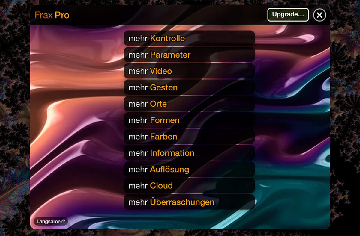 Der zweite, mögliche In-App-Kauf ist die PRO-Version. Wenn man diese erwirbt (Kosten bei mir aktuell ca. 8 EUR), erhält man auch Zugriff auf die Bereiche "Designen", wo man noch mehr Parameter verändern kann und auf den Bereich "Video aufnehmen", der es ermöglicht, einen Flug in ein Fraktal aufzuzeichnen. Ich habe mir diese Pro-Version noch gekauft, da ich die Entwickler unterstützen möchte. Die Features, die ich dadurch erhalte sind garnicht mal nötig gewesen – aber es ist natürlich toll, wenn man noch mehr Knöpfe und Presets hat, mit denen man spielen kann. ;-)