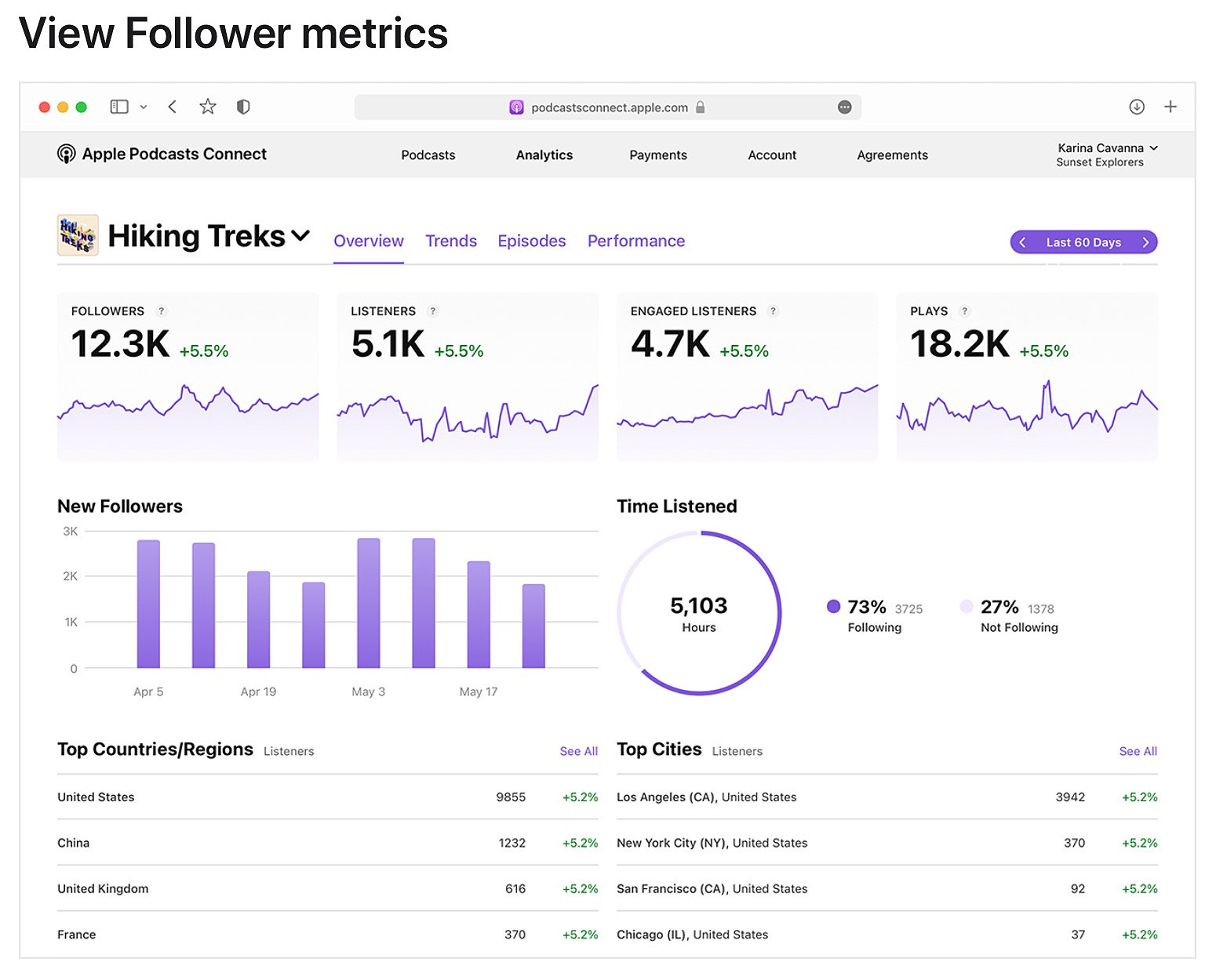 From the Analytics tab, creators will be able to view followers per show and easily measure followers across shows. Once selecting a show, they can quickly view the number of New Followers netted over the last week, month, 60 days, and all time. They can also see Time Listened as a precent of those following and not following the show. By navigating to the Trends menu, creators can view a graph of followers over time and the number of followers gained or lost on a specific day or during a specified range.