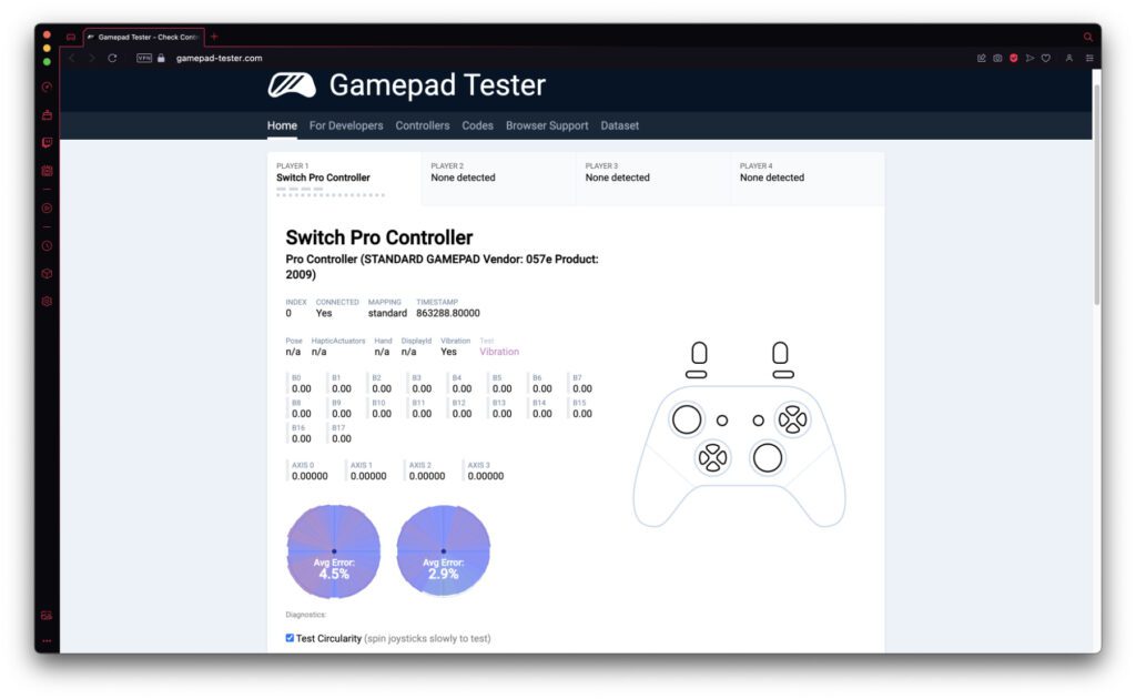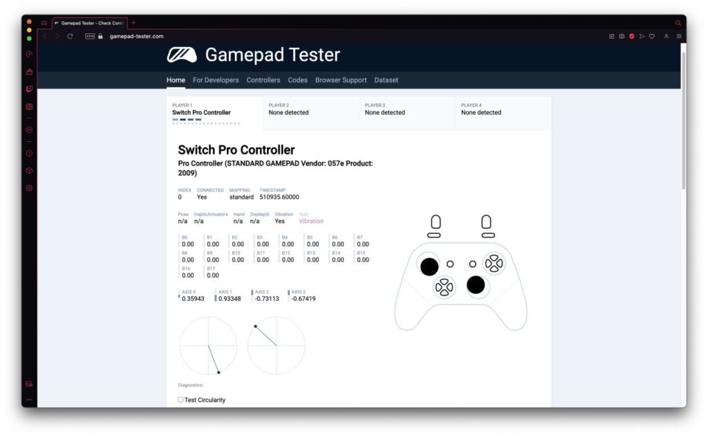 Öffnet einfach die Gamepad Tester Webseite, schließt euren Controller per Bluetooth oder USB an und macht dann damit irgendeine Eingabe. Es sollte automatisch eine Übersicht der Knöpfe, Tasten und Sticks sowie eine Grafik für die Darstellung des Geräts erscheinen. Drückt ihr nun einzelne Tasten oder eine Kombination aus verschiedenen Knöpfen, dann wird selbiges angezeigt und neben der Controller-Grafik auch in einer Tabelle mit den Button-Bezeichnungen vermerkt. Für die meist zwei Joysticks an modernen Controllern gibt es eine Anzeige mit mehreren Achsen sowie einen Circularity-Test. Es kann also getestet werden, wie akkurat die Kreise sind, die man formen kann.