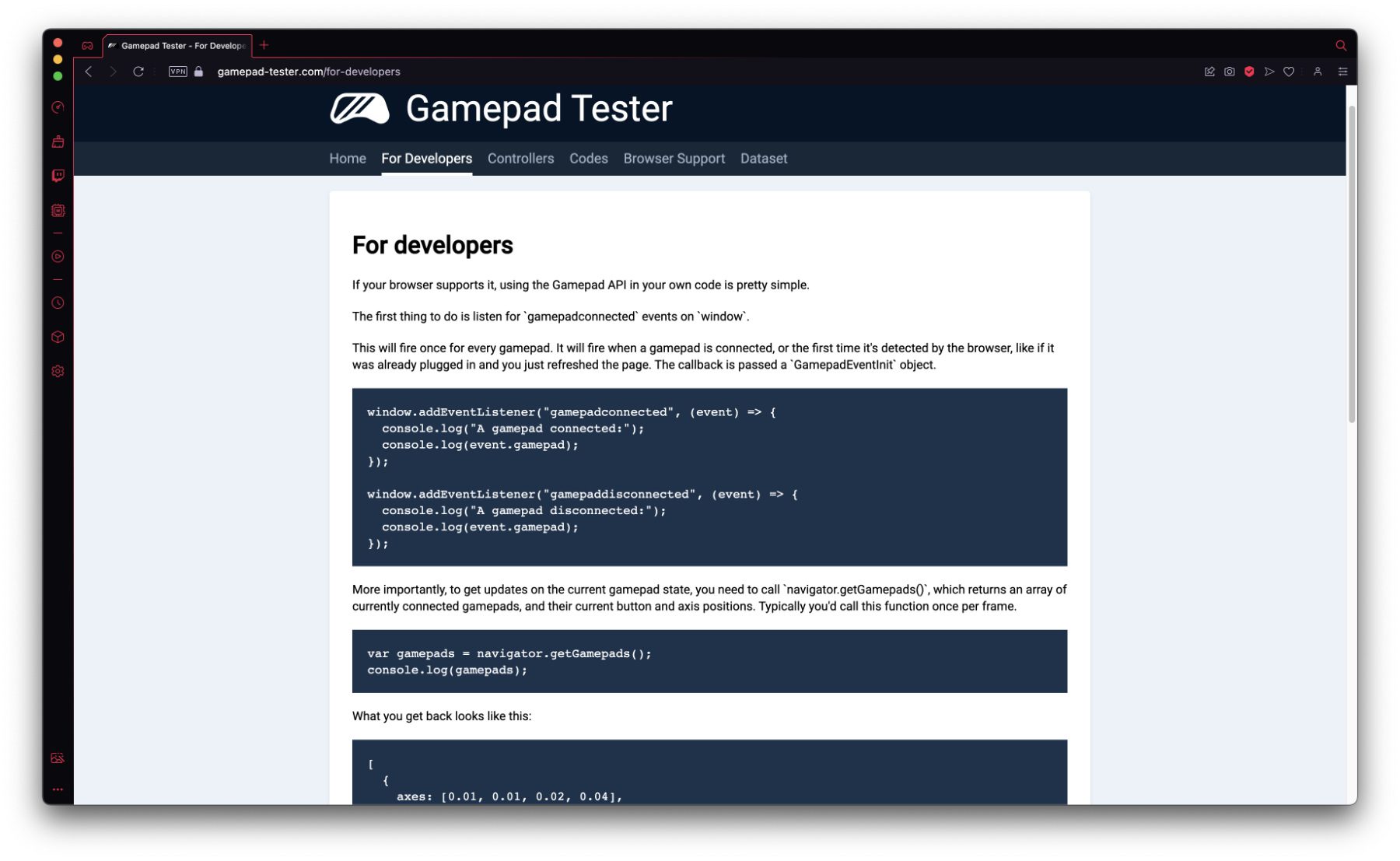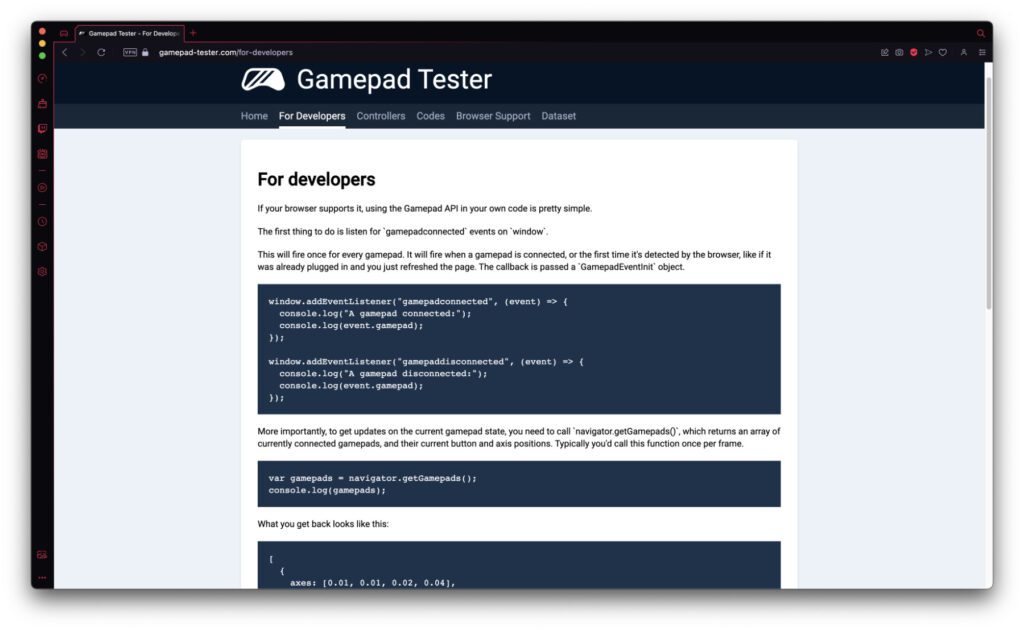 Wer sich für die Softwareentwicklung hinter dem Werkzeug interessiert oder die API selber verwenden will, sollte mal in den Tab „For Developers“ klicken. Dort gibt es den nötigen Code für die Einbindung sowie einen Link zur Developer-Seite von Mozilla, wo es weitere Informationen und Hintergründe zur Technik gibt. Wollt ihr also nicht nur feststellen, ob ihr euren Controller reparieren (lassen) müsst, sondern auch die dafür zur Verfügung stehende Technik selber nutzen, dann könnt ihr hier die ersten Schritte machen. Ich persönlich bin aber schonmal damit zufrieden, dass mein Pro Controller gut funktioniert. Immerhin kommt bald das neue Zelda-Spiel raus :D