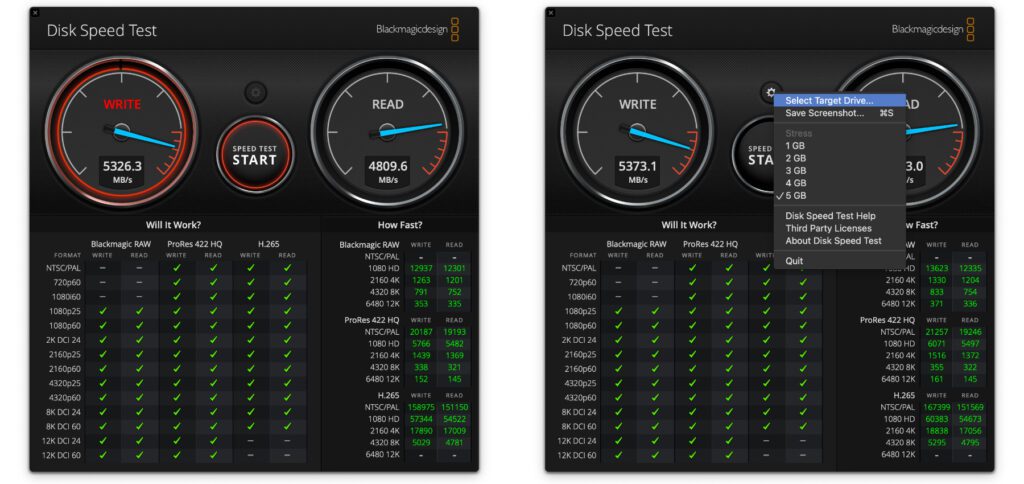 Egal ob interne Massenspeicher, externe Festplatten oder USB-Sticks – mit der Blackmagic Disk Speed Test App könnt ihr die Lese- und Schreib-Geschwindigkeiten dieser Speichermedien respektive der USB-Ports, über die sie angeschlossen sind, ermitteln. Die App ist dabei nicht mit der Blackmagic RAW Speed Test App zu verwechseln, die mit DaVinci Resolve installiert wird. Ihr findet die Blackmagic Disk Speed Test App als kostenloses Angebot im Mac App Store. Nach der Installation könnt ihr über den „Speed Test Start“-Button den Test anstoßen. Darüber befindet sich aber auch ein Zahnrad-Button, über den ihr zuvor z. B. ein anderes Speichermedium, also die externe Festplatte oder den USB-Stick, auswählen könnt.