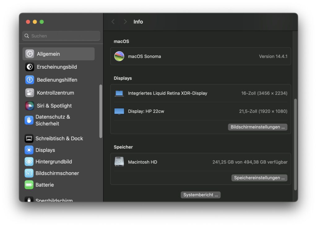 Bis macOS 12 Monterey hatte das „Über diesen Mac“-Fenster noch verschiedene Reiter. Über diese ließ sich mehr über das Display, die Festplatte und den Support-Status herausfinden. Zudem gab es einen Tab für Informationsmaterial, etwa mit einem Link zum Online-Datenblatt des genutzten Mac. Diese ganzen Sachen wurden ab macOS 13 Ventura in die Systemeinstellungen ausgelagert. Im „Über diesen Mac“-Fenster gibt es deshalb nun den „Weitere Infos“-Button. Klickt ihr diesen an, landet ihr im Bereich Allgemein -> Info der Systemeinstellungen. Dort gibt es nochmals die oben aufgezeigten Daten, aber auch Angaben zur Größe des Massenspeichers (Macintosh HD), Infos zum Display, etc.