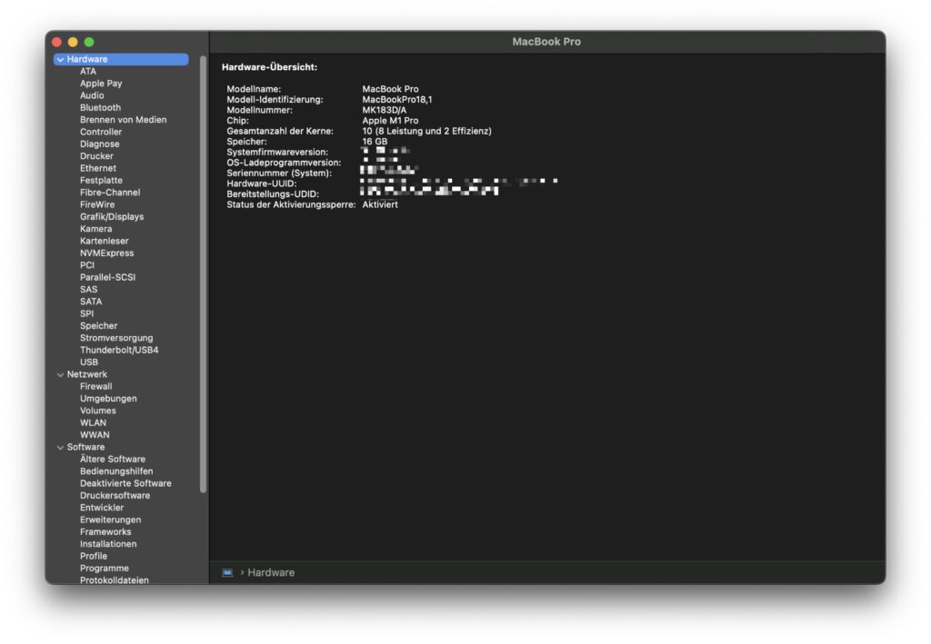 Weiter ins Detail könnt ihr dabei gehen, wenn ihr entweder mit einem der Buttons in den einzelnen Bereichen interagiert oder ganz unten den „Systembericht…“-Button anklickt. Hier kommen wir nun in einen recht technischen Bereich. Allerdings ist der erste aufgerufene Listenpunkt „Hardware“. Und darin findet ihr detailliertere Versionen der obigen Infos. Etwa die Modell-Identifizierung eures Mac, die Modellnummer, bei M-Chips die Anzahl der Leistungs- und der Effizienz-Kerne, Firmware-Versionen und einiges mehr. Klickt ihr einen weiteren Listenpunkt (links) an, erhaltet ihr (rechts) noch viele weitere Infos. So könnt ihr zahlreiche Komponenten eures Mac überprüfen.