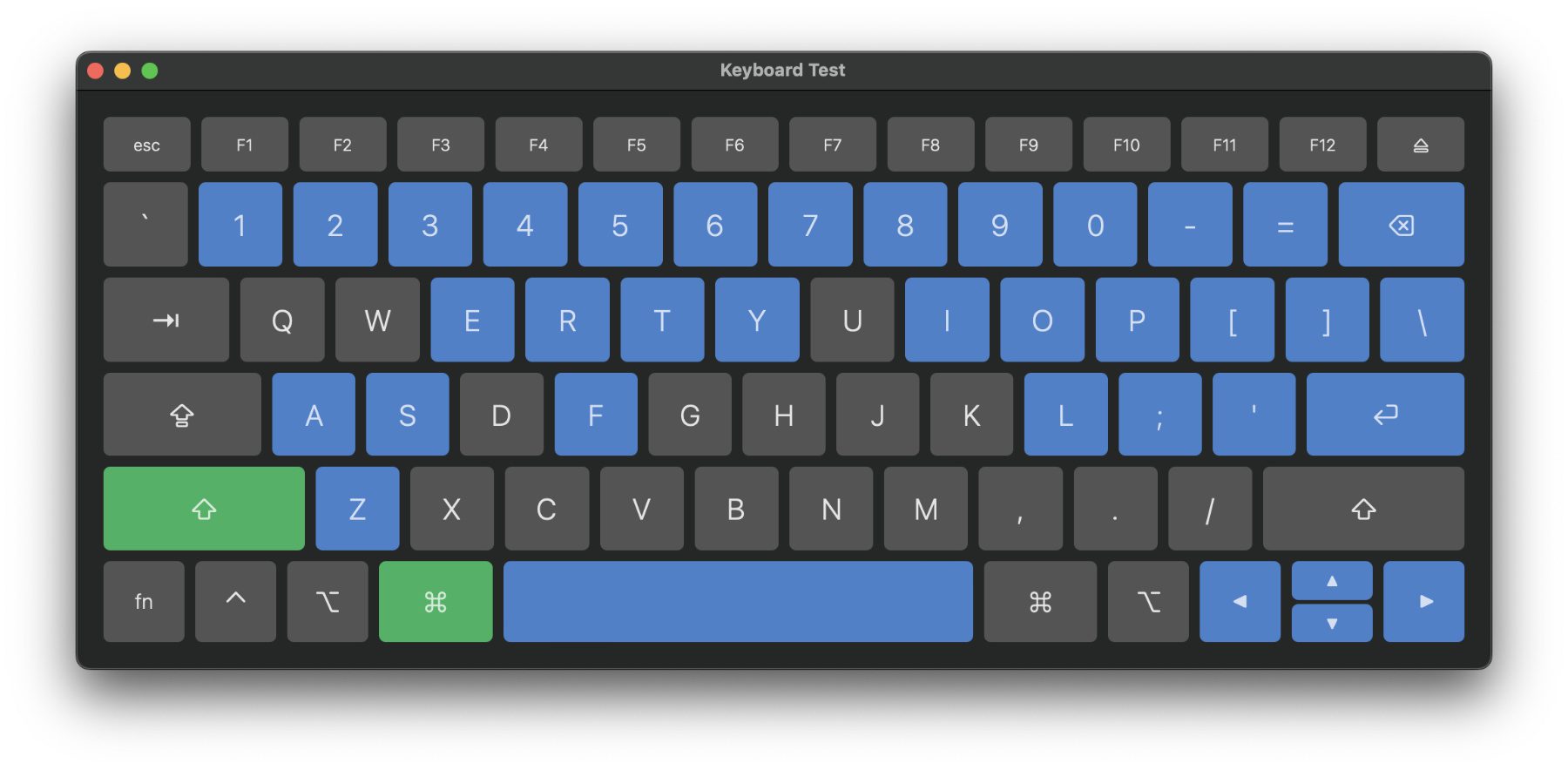 Klickt ihr den „Keyboard Test“ der Inspect App an, dann wird euch ein Fenster mit einer Tastatur-Grafik angezeigt. Diese hat zwar ein QWERTY-Layout, ihr könnt aber trotzdem QWERTZ- oder andere Layouts damit testen. Drückt ihr eine Taste, dann wird diese – wenn sie denn funktioniert – markiert. Drückt ihr eine Taste und sie wird nicht farblich unterlegt, dann könnte sie kaputt sein oder zumindest feststecken. Der Keyboard Test kann übrigens für externe Tastaturen (sowohl Apples Magic Keyboard als auch Drittanbieter-Tastaturen) sowie für interne Tastaturen des MacBooks genutzt werden.