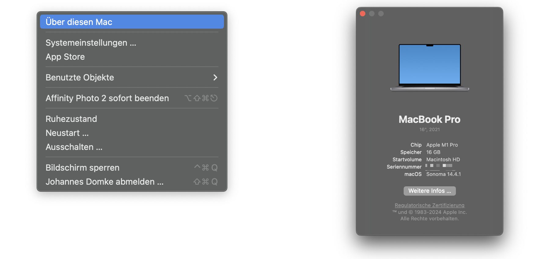 Der erste Schritt sollte ein Blick in das „Über diesen Mac“-Fenster sein, das ihr über das Apple-Logo in der Menüleiste (oben links) aufrufen könnt. Denn dort findet ihr die genaue Bezeichnung des Apple-Computers, seinen Jahrgang, den verbauten Prozessor (z. B. Intel-CPU) oder Systemchip (z. B. M1, M2 oder M3), neben „Speicher“ die Größe des Arbeitsspeichers und so weiter. Bei Intel-Macs gibt es auch noch eine Zeile für den Grafik-Chip (GPU). Weiterhin könnt ihr dort die Seriennummer einsehen und sie ggf. mit der Angabe auf der Rechnung abgleichen. Zuletzt wird euch aufgezeigt, welche macOS-Version installiert ist.