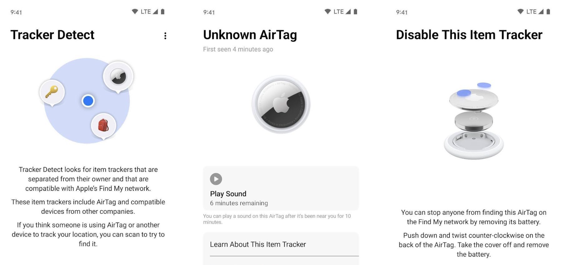 Aber auch hier ist das Hauptziel wahrscheinlich eher: Stalking abwehren. In der Tracker-Erkennung App für Android-Geräte gibt es neben der Funktion zum Abspielen eines Sounds auch eine bebilderte Anleitung zum Entnehmen der AirTag-Batterie, um das Tracking direkt zu stoppen. Was die App sonst so bietet, das zeigen die (leider noch auf Englisch gehaltenen) Screenshots auf der App-Seite im Google Play Store.