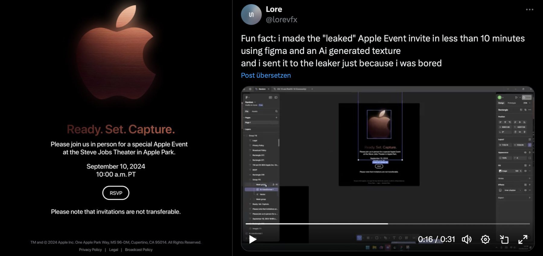 In besagtem Tweet heißt es von dem italienischen Betreiber des Accounts, dass er den Fake-Screenshot in weniger als 10 Minuten zusammengebaut hat. Verwendet wurde dabei die Grafik-Anwendung Figma – und die Textur für das Apple-Logo wurde von einer KI erstellt. Durch Übernahme des bekannten Designs von Apples Event-Ankündigungen sah die fertige Grafik ziemlich echt aus. „Und ich habe sie dem Leaker nur geschickt, weil ich Langeweile hatte“, wird der Tweet geschlossen, dem dann noch ein halbminütiges Video anhängt, in dem das Figma-Projekt der Fake-Leak-Grafik gezeigt wird.