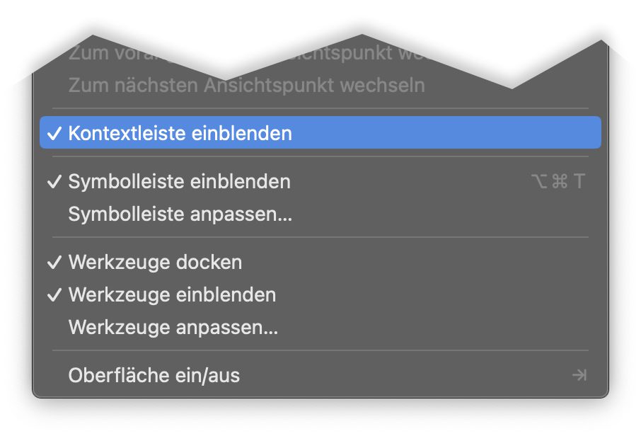 Falls ihr das oben beschriebene Kästchen sowie die anderen individuellen Werkzeug-Einstellungen nicht im Fenster der Affinity Photo App findet, dann ist wahrscheinlich die Kontextleiste deaktiviert. Das macht aber nichts, denn ihr könnt sie jederzeit wieder anzeigen lassen. Dazu klickt ihr einfach in der Menüleiste (unter macOS ganz oben am Bildschirmrand) auf den Menüpunkt „Ansicht“ sowie in dessen Menü auf „Kontextleiste einblenden“. Schon stehen euch für jedes ausgewählte Werkzeug die individuell passenden Optionen bereit.
