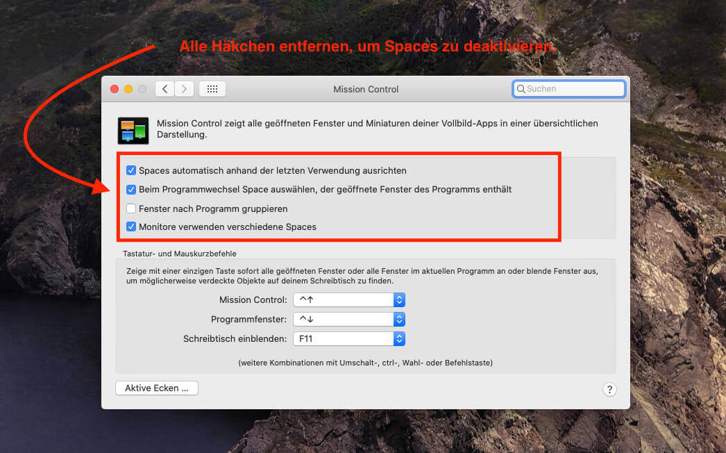 Wie dem auch sei: Es gibt einen leichten Weg, die Funktion "Spaces" unter macOS zu deaktivieren. Wie die Überschrift schon sagt, führt dieser über die Systemeinstellungen und dort über den Button "Mission Control". Hier gibt es vier Punkte, die man anhaken kann und soweit ich dies sehe, sollte man bei allen das Häkchen wegnehmen, damit der Mac nicht mehr auf verschiedene Spaces zurückgreift.