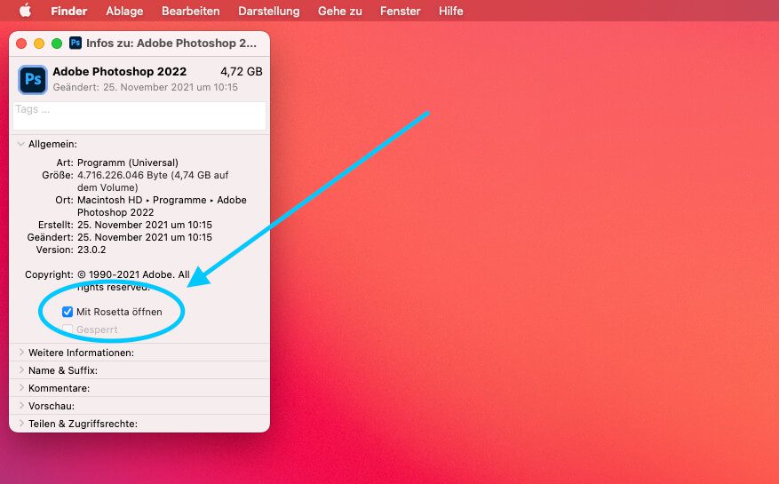 Die Lösung: Adobe Photoshop mit Rosetta starten