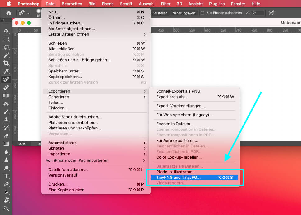 Mein gerne genutzter Photoshop Filter namens" Luminar" ließ sich durch eine einfache Installation wieder in Photoshop einbinden. Was deutlich mehr Überredungskunst brauchte, war das Photoshop Plugin "TinyPNG", welches dafür sorgt, dass die Grafiken als speicherplatzoptimierte PNG- oder JPG-Datei für das Web exportiert werden. In der Regel ist es unter Ablage > Export sichtbar. In meinem Fall war der Menüeintrag – trotz der erneuten Installation (Plugin und Lizenzdatei in den Ordner "Plugins" legen) nicht mehr zu sehen.