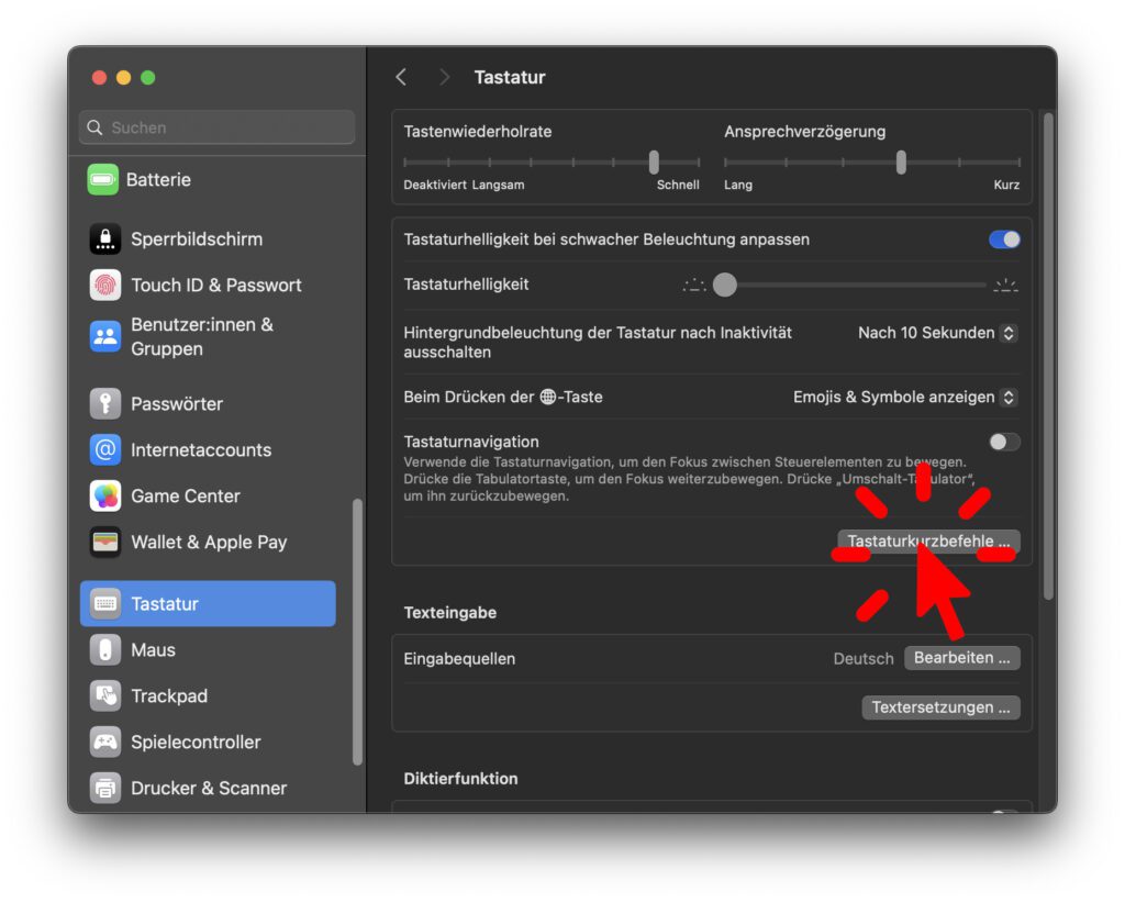 - Klickt auf den „Tastaturkurzbefehle…“-Button