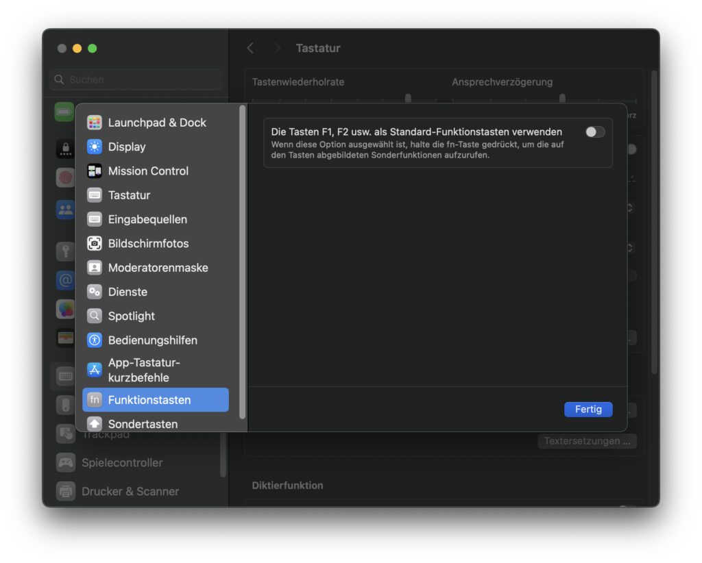 - Wählt im Popup-Menü links Funktionstasten aus und (de)aktiviert rechts den Schalter