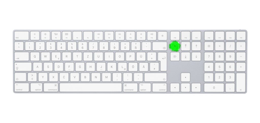 Auf großen „Magic Keyboard“-Tastaturen mit Nummernblock ist die Anordnung der Tasten ein bisschen anders. Dort findet ihr die fn-Taste direkt unter der F13-Taste. Sie befindet sich also in dem Tastenblock über den Pfeiltasten. Selbige befinden sich zwischen dem Buchstabenteil der Tastatur links und dem Nummernblock rechts.