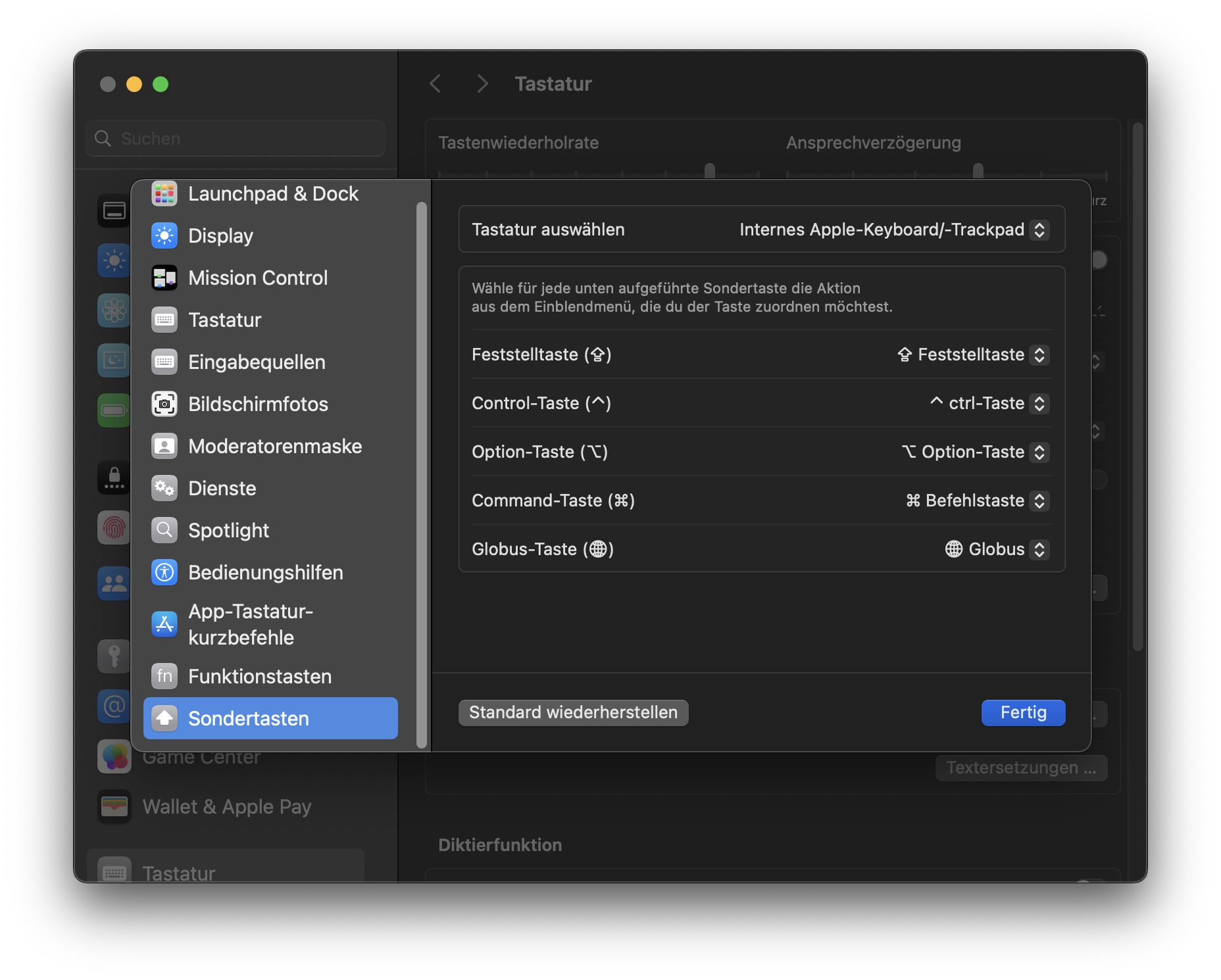 Je nach Workflow kann es anstelle der vorgesehenen fn-Möglichkeiten auch sinnvoll sein, diese Taste als eine andere Funktionstaste zu nutzen. Dafür könnt ihr sie direkt in den Einstellungen von macOS umwidmen. Hierzu geht ihr wieder in die Tastatur-Einstellungen und klickt abermals auf den „Tastaturkurzbefehle…“-Button. In dessen Popup-Menü wählt ihr nun aber links Sondertasten aus.