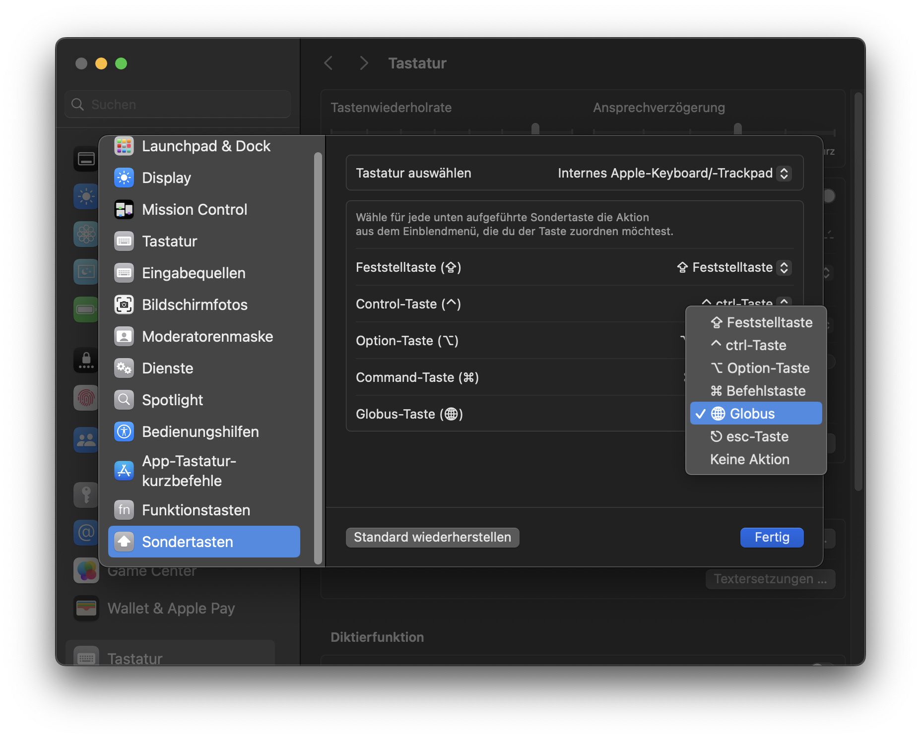 Wo ist die Globus-Taste auf der Mac-Tastatur?