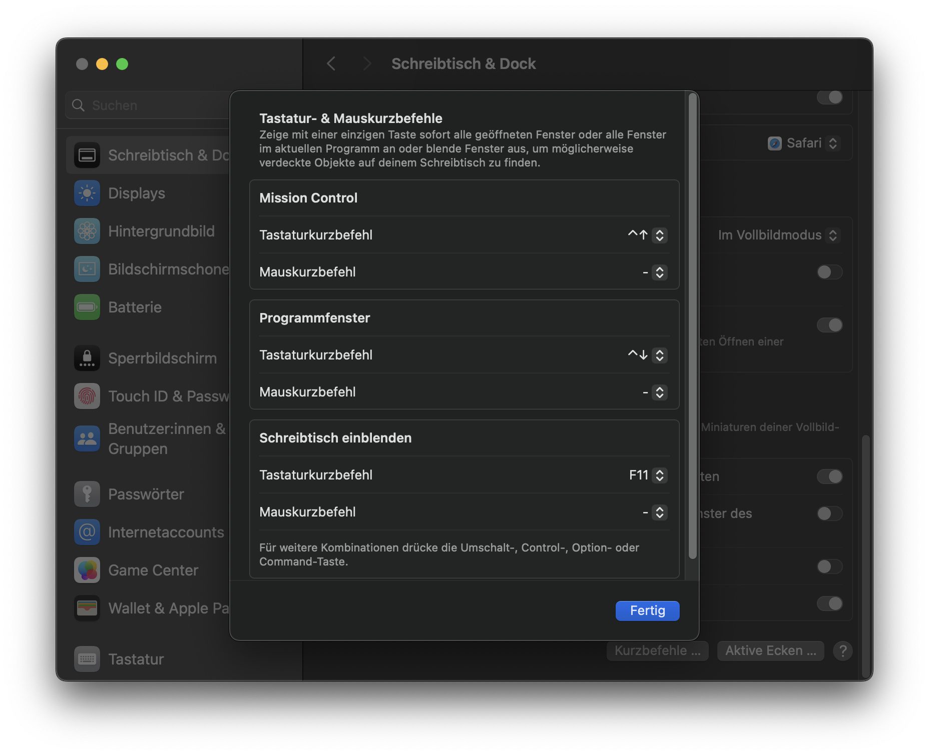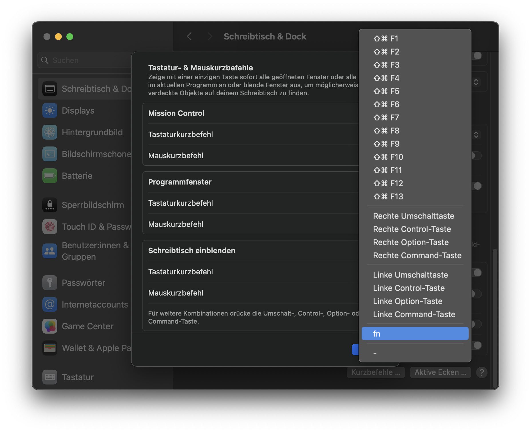 - Stellt, falls gewünscht, zum Aufrufen von Mission Control oder dem Schreibtisch die fn- oder eine andere Taste ein