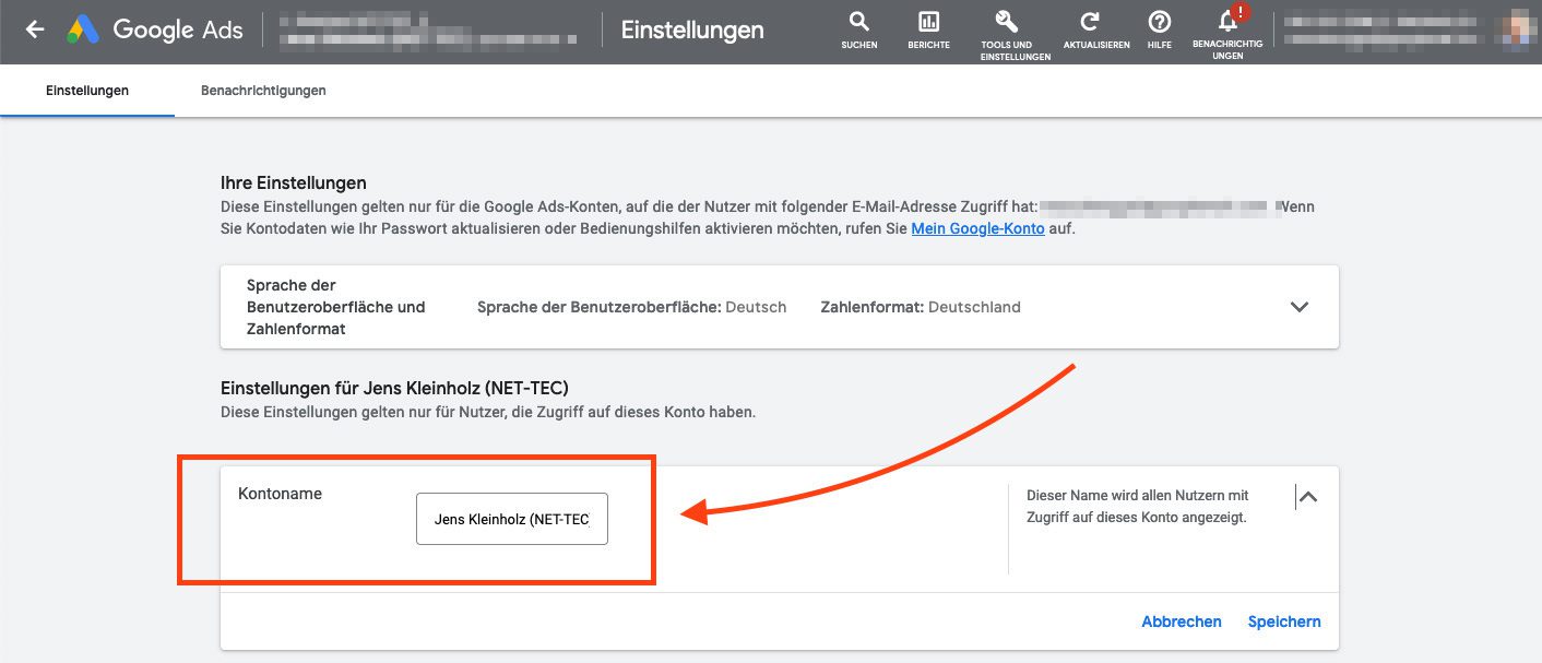 Wichtig ist hier, dass ihr tatsächlich Zugriff auf das entsprechende Kundenkonto habt und der Kunde euch genug Rechte erteilt hat, damit ihr den Namen des Kontos bearbeiten dürft. Aber so funktioniert es in der Praxis: