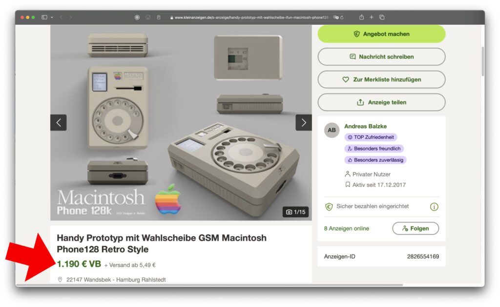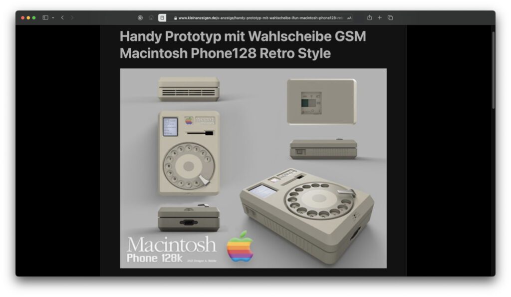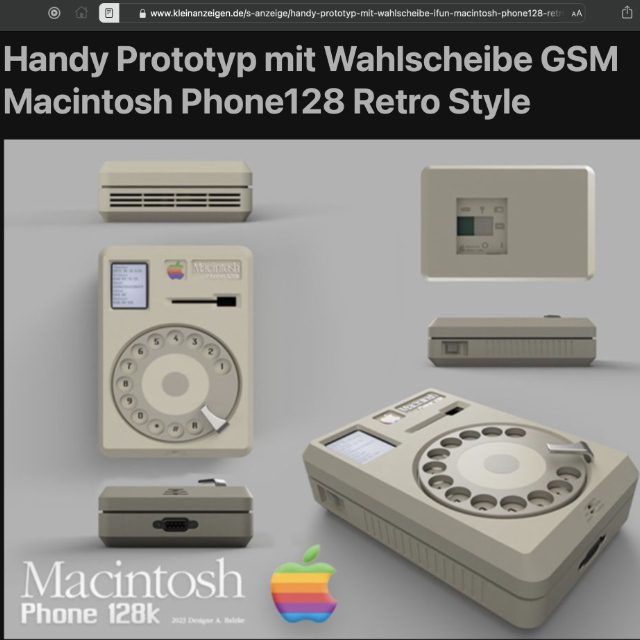 Heute habe ich einen Webfund für euch, über den ich am Wochenende gestolpert bin. Bei Kleinanzeigen habe ich das „Macintosh Phone 128k“ gefunden. Dabei handelt es sich um einen beigen Kunststoffkasten mit Wählscheibe, der dank SIM-Karte als Mobiltelefon genutzt werden kann. Auf der Anzeigenseite sind neben Fotos auch 3D-Renderings zu finden, welche das Design des angeblichen Prototypen verdeutlichen. Im Anzeigentext wird dann erst richtig klar, dass es sich – trotz Apple-Logos und „Macintosh“-Namen – lediglich um ein modernes Designprojekt handelt. Es ist also kein offizielles Apple-Produkt, das wiederentdeckt wurde oder dergleichen.