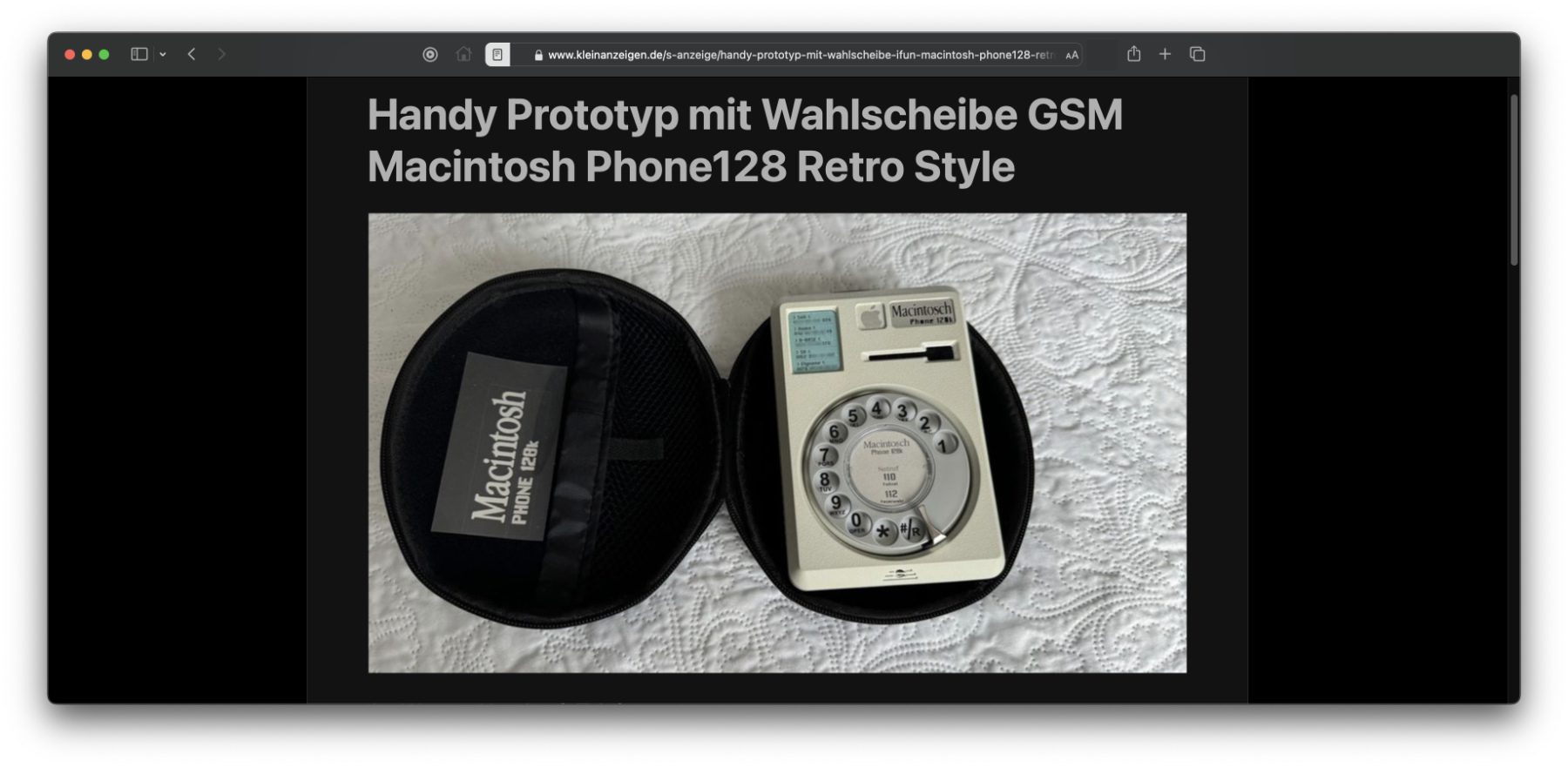 Heute habe ich einen Webfund für euch, über den ich am Wochenende gestolpert bin. Bei Kleinanzeigen habe ich das „Macintosh Phone 128k“ gefunden. Dabei handelt es sich um einen beigen Kunststoffkasten mit Wählscheibe, der dank SIM-Karte als Mobiltelefon genutzt werden kann. Auf der Anzeigenseite sind neben Fotos auch 3D-Renderings zu finden, welche das Design des angeblichen Prototypen verdeutlichen. Im Anzeigentext wird dann erst richtig klar, dass es sich – trotz Apple-Logos und „Macintosh“-Namen – lediglich um ein modernes Designprojekt handelt. Es ist also kein offizielles Apple-Produkt, das wiederentdeckt wurde oder dergleichen.
