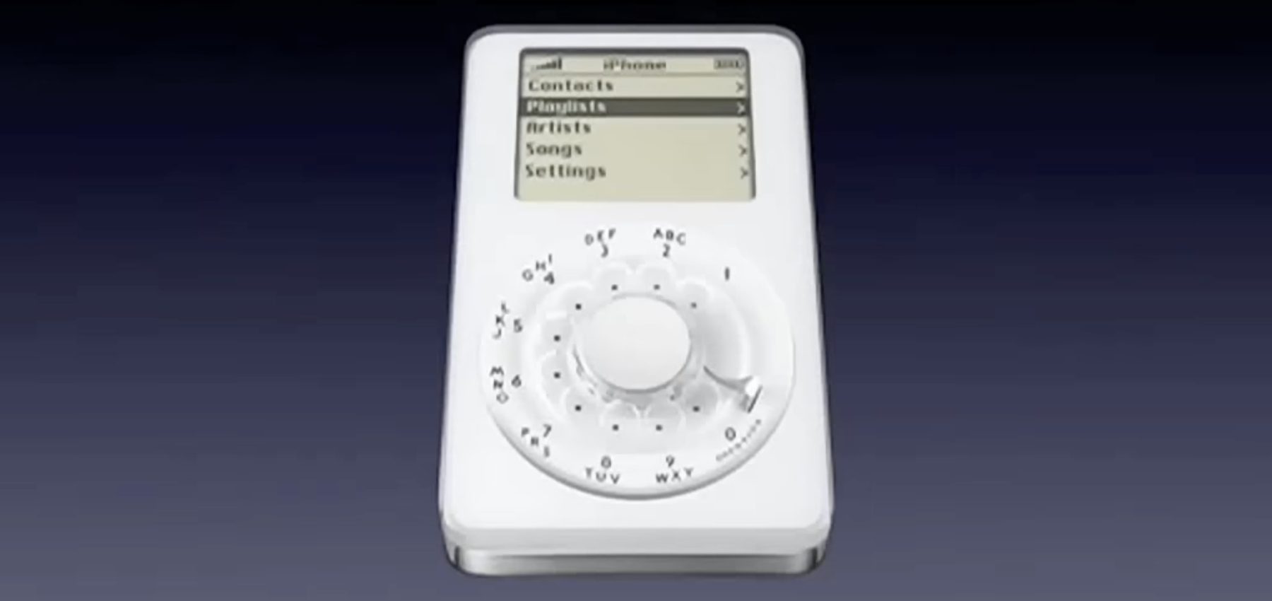 Erinnern wir uns zurück an Steve Jobs’ Auftritt bei der MacWorld-Keynote 2007. Dort stellte er das allererste iPhone vor. Im Rahmen der Hinleitung zum eigentlichen Produkt ging er über die Nachteile bereits bestehender Smartphones ein, vornehmlich der physischen Tastatur. Als Scherz zeigte er dennoch ein Bild, das die Kombination aus iPod und Telefon verdeutlichen sollte: ein iPod mit Wählscheibe. Nachdem damit ein paar Lacher abgeholt wurden, ging es um das tatsächliche Produkt. Ob Andreas Balzke die Inspiration für sein Bastelprojekt darin gefunden hat, kann man nur vermuten.